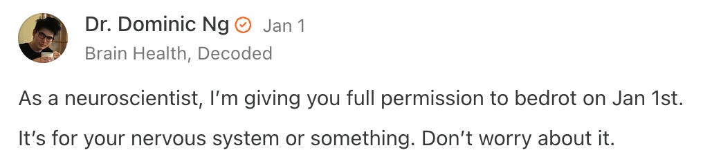 So I took Dr. Dominic Ng’s advice and allowed myself to kick off the new year by doing… nothing. Nothing at all. Brain-rotting. Bed-rotting. Whatever it’s called.